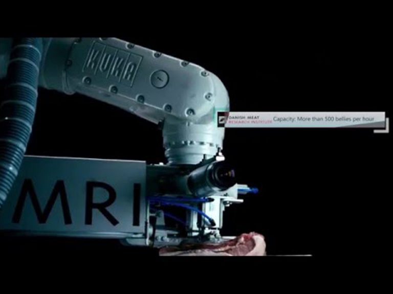 Ein Roboter aus Dänemark könnte bald eine der beschwerlichsten Arbeiten im Schlachthof, das Herauslösen einzelner Rippen aus Schweinebauchstücken, übernehmen....