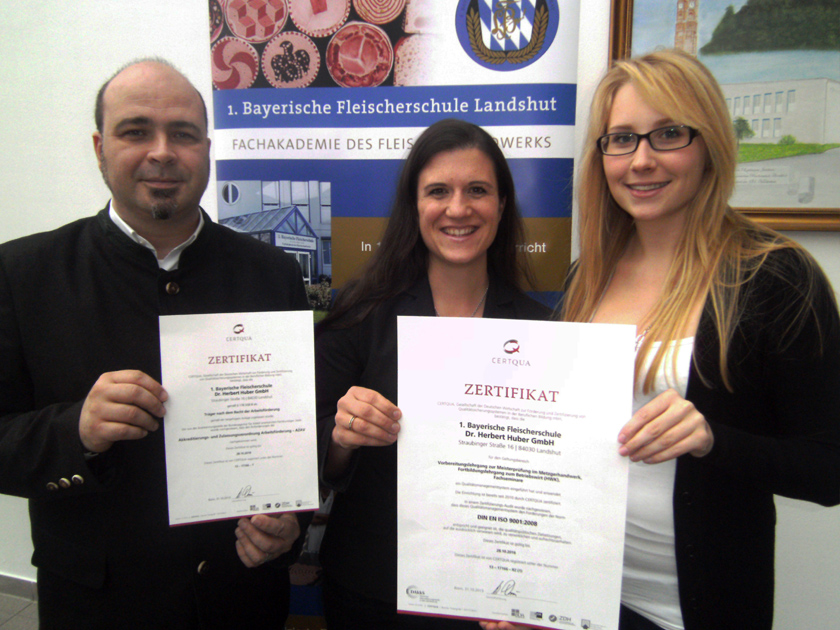 Seit 2010 lässt die 1. Bayerische Fleischerschule Landshut ihre internen Strukturen durch die akkreditierte Zertifizierungsstelle „Certqua“ prüfen und bestand nun ein Wiederholungsaudit mit Bestnote. Hohe Bildungsqualität, Innovationsfähigkeit und starke Kundenorientierung: All dies wurde der Fleischerschule nun wieder von unabhängiger Stelle bescheinigt. Die „Certqua“ (Gesellschaft der Deutschen Wirtschaft zur Förderung und Zertifizierung von Qualitätssicherungssystemen in der Beruflichen Bildung mbH) hat die Fleischerschule Landshut nach der deutschen und europäischen Norm DIN EN ISO 9001:2008 auditiert und zertifiziert. Ein externer Experte wie Certqua-Auditor Henry Klesse hat oft einen objektiveren Blick auf eingespielte Betriebsabläufe, Bildungsangebote, Lehr- und Lernmethoden. Nicht nur Politik und Wirtschaft stellen mit ständig sich ändernden Rahmenbedingungen neue Anforderungen an Bildungsträger und ihre Dienstleistungen, sondern auch Kunden, Partner und Lehrgangsteilnehmer. Für diese wird es daher immer wichtiger, auf neue Anforderungen schnell und flexibel zu reagieren, um im Wettbewerb bestehen zu können. Voraussetzung sind Qualitätsmanagementsysteme, kontinuierliche Überprüfungen von Arbeitsabläufen, Organisation etc. Hohe Anforderungen wurden auch an die Zulassung als Maßnahmenträger der Arbeitsförderung gemäß AZAV (Akkreditierungs- und Zulassungsverordnung – Arbeitsförderung) gestellt; damit will der Gesetzgeber die Qualität der Anbieter und damit die Eingliederungschancen Betroffener am Arbeitsmarkt verbessern. Das vor vier Jahren implizierte QM-System wird kontinuierlich weiterentwickelt und von allen Mitarbeitern gelebt. Henry Klesse war überrascht, dass die Kundenorientierung kontinuierlich geschärft werde und so die Rolle als Marktführer weiter ausgebaut werden könne. Unterstützt bei der Vorbereitung auf das Audit wird die 1. BFS seit vier Jahren von der Intrasys GmbH in Altdorf und ihrem QM-Beauftragen Klaus Eder. Schulgeschäftsführerin Barbara Zinkl zeigte sich stolz auf die erfolgreiche Neu-Zertifizierung: „Wir haben unter Beweis gestellt, dass wir optimale Ausbildung mit bester Vorbereitung auf die Meisterprüfung im Metzgerhandwerk und auf die Prüfung zum Betriebswirt des Handwerks wie auch in unseren handwerksbezogenen Fachseminaren bieten können.“ www.fleischerschule-landshut.de