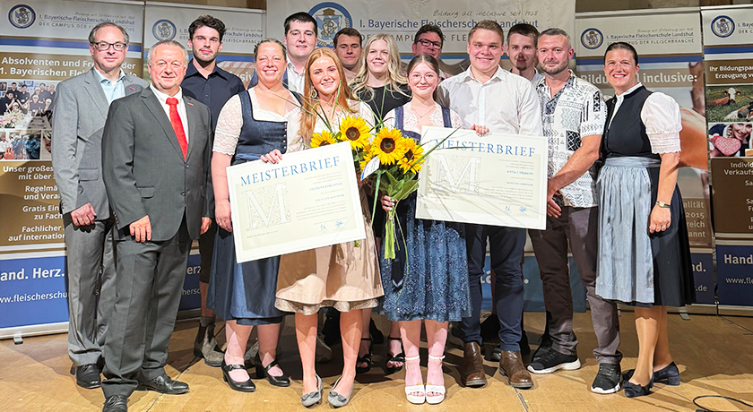 Die Teilnehmerinnen und Teilnehmer des Kurses kamen aus Deutschland und Österreich. Manche stammen aus der Landwirtschaft, andere aus Schlachtbetrieben, dem klassischen Handwerk, dem Handel und Großhandel. Diese Vielfalt unterstreicht die Breite der Ausbildung und die Bedeutung der Fleischerschule als zentrale Ausbildungsstätte für die Branche. Barbara Zinkl-Funk, Geschäftsführende Gesellschafterin der Schule, begrüßte zahlreiche Ehrengäste und die Absolventinnen und Absolventen und deren Familien. Sie hob den Einsatz und die Hingabe der Teilnehmenden als inspirierendes Beispiel für den Berufsstand hervor und betonte die Bedeutung der Ausbildung für die Zukunft der Branche. Der Prüfungsausschussvorsitzende Florian Lang gratulierte den neuen Meistern und Meisterinnen und dankte den ehrenamtlichen Prüferinnen und Prüfern für ihr Engagement zum Wohl des Branchennachwuchses.