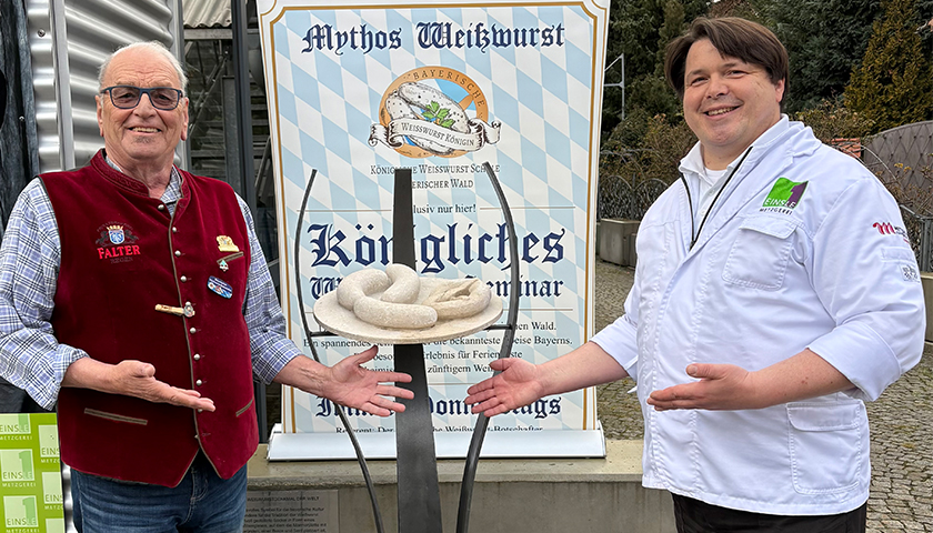 Nicht in München, sondern in Bodenmais: Bayern hat ein neues Wahrzeichen – und das in Form seiner wohl bekanntesten Spezialität: der Weißwurst. Dort wurde nun das erste Weißwurstdenkmal der Welt offiziell präsentiert. Damit hat die Metzger-Innung ArberLand nach langen Verhandlungen den Münchner Gastronomen ein Schnippchen geschlagen. „Es ist kaum zu glauben, dass München – die vermeintliche Heimat der Weißwurst – bis heute kein Denkmal für dieses Kulturgut errichtet hat“, sagt der Bayerische Weißwurstbotschafter Bertl Fritz (li.) augenzwinkernd. Nun steht das erste Denkmal dieser Art in Bodenmais, direkt neben der Metzgerei von Obermeister Stefan Einsle (re.) in der Bahnhofstraße 35.