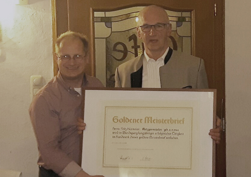 Im Rahmen der jährlichen Jahreshauptversammlung der Metzger-Innung Rosenheim, zeichnete Obermeister Hubert Lohberger den Metzgermeister Fritz Kürmeier mit dem Goldenen Meisterbrief aus. Der erfahrene Metzgermeister aus Brannenburg legte seine Meisterprüfung 1967 ab und übernahm am 1.1.1975 den elterlichen Betrieb, der heute von seinem Sohn Andreas und dessen Ehefrau Bettina Kürmeier-Lechner geführt wird. Die Metzgerei gibt es seit 1924 und wurde von Fritz Kürmeier sen. gegründet. Der Geehrte bildete seitdem mehr als zehn Lehrlinge aus und war außerdem als Rechnungsprüfer und Mitglied der Vorstandschaft der Metzgerinnung tätig.