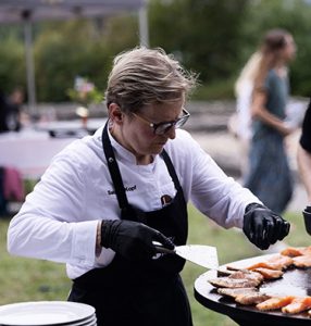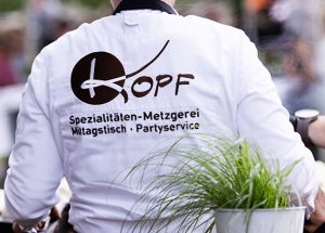 Gut die Hälfte des Umsatzes erwirtschaftet die Metzgerei mit Laden und dem Mittagstisch im angegliederten „Gaststüble“ (ca. 200 Essen täglich, drei Gerichte zur Wahl, die erst morgens um 8 Uhr feststehen) und der Belieferung dreier Kindergärten, Senioren und Firmen mit warmen Speisen. Die andere Hälfte erbringt das dann 37-köpfige „Kopfe“-Team bei Familien- und Firmenfeiern – mit oder ohne BBQ-Equipment – Vereinsfesten und Hochzeiten, die nicht „das Doppelte kosten“: bis 450 Personen, oft mehrfach pro Woche. „Einst einige Essen wie Schweinsbraten und Siedefleisch …
