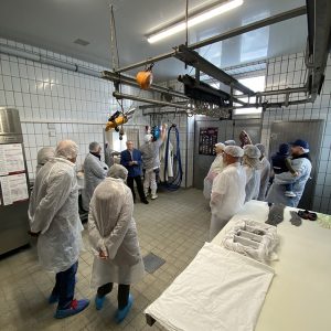 Eine halbe Stunde nach dem Beginn des „Tags der offenen Tür“ startete die erste Führung durch den Betrieb in der Küche, dem „Reich“ Silvia Obermayrs, die gelernte Köchin ist. Etwa zwölf interessierte Gäste gingen dann die Wurstproduktion, in der Senior Sebastian Hofberger schon wartete. Der Fokus liegt auf der Wurstproduktion, weshalb 16 bis 20 halbe Schweine und ein Bulle pro Woche hier verarbeitet werden. Auch er helfe dem vierköpfigen Team hier gerne mit. Die Gästegruppe – in Hygienekleidung gewandet – hatte sich inzwischen verdoppelt und in der Wurstküche eingefunden. Nun wurden frische Weißwürste hergestellt. Viele zückten ihre Handys und machten Fotos und Videos.