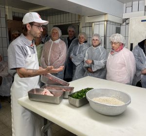 Fleischermeister und Produktionsleiter Daniel Asael (li.), der seit 2022 hier arbeitet, bereitete das Brät am Kutter zu und erklärte die Prozessschritte. Danach füllte Metzgergeselle Andre Biberger die 90 bis 95 g schweren Weißwürste in Schweinedärme (Kaliber 28/30) ab. Ein Kollege drehte sie per Hand ab und gab danach weitere TK-Teiglinge für frische Brezn in den Kombidämpfer. Nach dem Brühen der Würste genossen die Gäste die frischen Weißwürste. Weitere Führungen folgten.