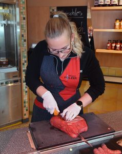 Es ging um Fleisch in der Ernährung, Regionalität, wie man diese Kunden vermittelt und um Unterschiede von Fleisch – vor allem Steaks – verschiedener Rinderrassen bzw. Schwein und Altersstufen. „Wir haben auch Fleisch zugeschnitten. Da habe ich einiges gelernt“, sagt sie. An Tag 3 bereitete Wolfgang Müller Fleischgerichte zu und gab allerlei praktische Tipps für den Verkaufsalltag an der Theke. „Auch in Sachen ‘nose-to-tail’, was ich sehr wichtig finde. Respekt vor dem Tier zu haben, auch das kann man den Kunden vermitteln. Ich bin ja auf einem Bauernhof groß geworden“, sagt die 24-Jährige. Es sei eine tolle, bunt gemischte Gruppe unterschiedlichen Alters und Vorkenntnissen gewesen. Noch am Vorabend der Prüfung habe man in Kleingruppen gelernt. Schriftlich galt es Fragen richtig anzukreuzen und in eigenen Worten zu beantworten, praktisch wurde u.a. ein Beratungsgespräch mit einem schwierigen Kunden simuliert, der das Wissen seines Gegenübers in Frage stellt. Sie bestand mit Bestnote und hatte Tränen in den Augen.