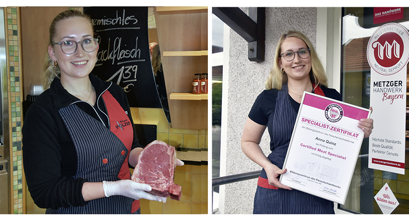 Vor drei Jahren jobbte sie beim Maibaum-Aufstellen in einem Ort ihrer Region in einem Getränkestand. Dort traf sie Philipp Gantner, Inhaber der Metzgerei Holzer, der sie fragte, ob sie bei ihm arbeiten wolle. Sie sagte zu und startete bei ihm und seiner Mutter Rita am 1. Juli 2022. „Beide waren sehr sympathisch. Das familiäre und berufliche Klima hier gefiel mir. Ich wurde herzlich aufgenommen. Sie nahmen mich in einer schwierigen Zeit auf. Ich verdanke ihnen sehr viel“, betont sie. Daher sei die Metzgerei ihre zweite Familie. Ihre Mutter – gelernte Landwirtin – arbeitet auch in einer Metzgerei und bestärkte sie im Jobwechsel. Auch ihre Tante und ihr Patenkind lernten Fleischerei-Fachverkäuferinnen. Sehr viel im Fachverkauf lernte sie von Rita Gantner. „Eines Tages stellte fest: ‘Ja, Metzgerei – das ist es’“, sagt sie. Sie arbeitet 40 Stunden an sechs Tagen. Neben dem Fachverkauf und der Beratung an der Theke richtet sie u.a. Bestellungen für Privat- und Großkunden oder den Web-Shop her und hilft bei Bedarf in den Filialen in Isen und Kirchseeon aus. „Nur in Sachen Fleisch war ich noch nicht fit, wollte mehr wissen“, ergänzt sie. Daher meldeten sie ihre Chefs für den „Meat Specialist Sales“-Kurs an der Fleischerschule in Augsburg an.