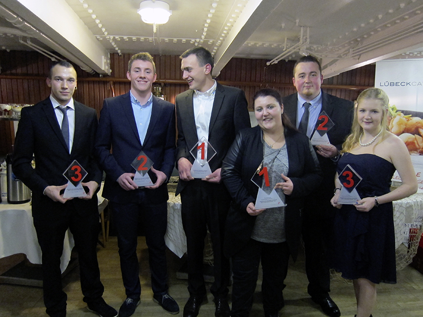 (Bildunterschrift): Die Siegerinnen und Sieger des Bundesleistungswettbewerbes der Fleischerjugend 2015: Marcel Stephan, Florian Wollmann, Felix Eberhardt, Julia Tappe, Hendrik Volker Süß und Jasmin Kulke (v.l.n.r.).