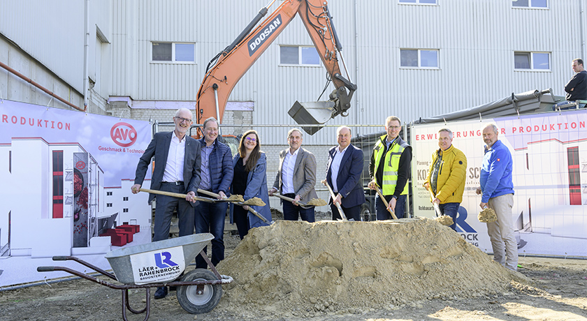 Am 28. März 2025 fand der offizielle erste Spatenstich auf dem Baugrund der AVO-Werke statt. Dazu lud das Unternehmem Viktor Hermeler, Bürgermeister der Gemeinde Belm, ein. Auch Architektin Maren Drees und Bauingenieur Christian Methner vom Archtitekturbüro Kornhage + Schubert aus Wallenhorst und Bauleiter Herbert Huil vom Bauunternehmen Läer + Rahenbrock aus Georgsmarienhütte waren zu Gast. Die beiden lokalen Unternehmen sind für die Planung und Umsetzung des Neubauvorhabens zuständig. Läer + Rahenbrock hatte AVO schon 2020 beim Neubau eines hochmodernen Logistikzentrums unterstützt.