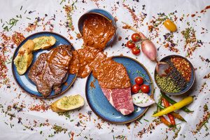 Delikatessen mit Huhn, wie vom Palmenstrand, gelingen etwa mit der „SoftFix Marinade Caribbean BBQ“. Orientalisch wird es mit dem Pistacchio-Gewürzsalz aus Pistazien, grünem Pfeffer und grünem Paprika. Ein weiteres Beispiel ist die Marinade „Beck SoftFix Marinade Pistacchio“, die das Grillgut in einen orientalischen Traum mit leicht nussigem Aroma und leuchtend grüner Farbe verwandelt. Rassig-scharf ist die „Beck SoftFix Marinade Five Peppers“ (li.). Für Braten und Gegrilltes eignet sich das „Chimicurri Gewürzsalz“.