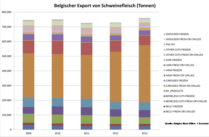 759.854 Tonnen frisches Schweinefleisch – inkl. Fett und Nebenprodukte, ohne Fleischwaren – haben die belgischen Fleischlieferanten 2013 auf ausländischen Märkten platziert. Gegenüber dem Vorjahr ist das ein Plus von 4,2 Prozent.