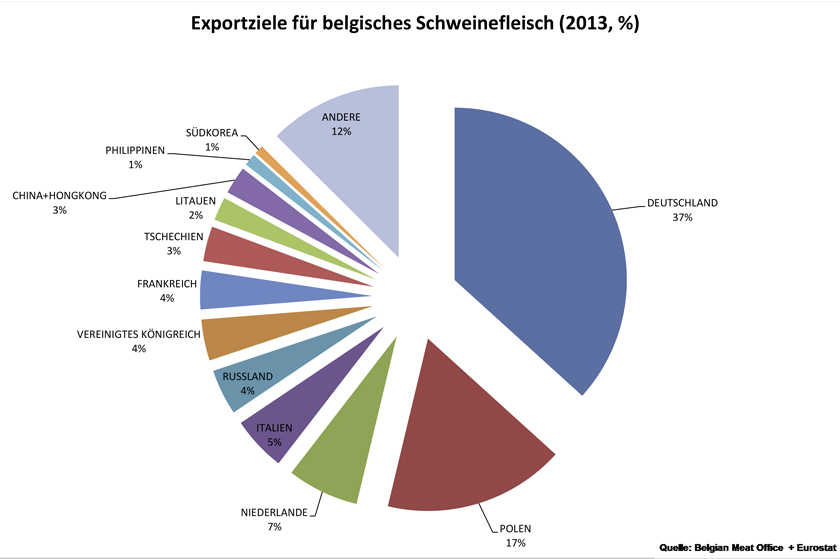 Im Drittlandsgeschäft stehen die Lieferungen nach Russland an oberster Stelle. Die Föderation importiert in erster Linie Fett und Schlachtnebenprodukte aus Belgien.