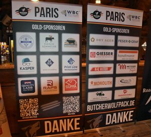 Sponsoren und Partner des Butcher Wolfpack: u.a, Monolith, Goldbeef, BESH, Royal Lamb, A. Handtmann Maschinenfabrik, Raps, K+G Wetter, Giesser Messer, Dry ager, Hagesüd, Transgourmet, Metzgerhandwerk Bayern, Fleischerschule Augsburg, MKN, Kasper Communications, SÜFFA, Aichinger, thekenplan, Develey Foodservice, Düker-Rex, Posch.
