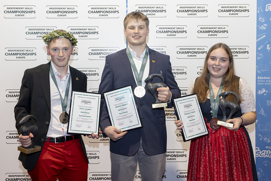 Für das deutsche Fleischerhandwerk trat David Hilpert (mi.) aus Weißenburg in Mittelfranken an, der sich bei einem nationalen Ausscheidungswettbewerb auf der IFFA 2025 durchgesetzt hatte. Mit ausnahmslos hervorragenden Leistungen setzte er sich durch und holte die Goldmedaille. Zweiter wurde Sven Lauber (li,. Schweiz) vor Simone Tieber (re., Österreich). Auf Platz 4 kam Asbjörn Geirsson (Island). Betreut wurde David Hilpert von der Expertin und Trainerin Britta Sickenberger vom Bundesleistungszentrum J.A. Heyne in Weiterstadt, die durch das zielgerichtete Training maßgeblichen Anteil an dem Erfolg hat. Teilnehmer aus Deutschland belegten unter ihrer Anleitung schon mehrfach Spitzenplätze.