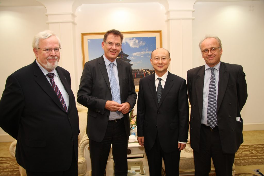 Im Bild (v.l.n.r.): Paul Brand (Vorsitzender VDF), Dr. Gerd Müller MdB (PStS BMELV), ZHI Shuping (Minister des Zentralamtes für Qualitätsüberwachung, Inspektion und Quarantäne, AQSIQ), Leopold Graf von Drechsel (Präsident ZDG)