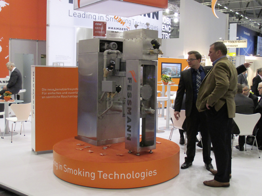 Als Weltneuheit präsentierte Fessmann auf der Süffa den flexiblen Raucherzeuger Ratio Hybrid RH325. Er bietet unterschiedliche Raucharten‚ kombiniert oder einzeln angewendet und ist als klassischer Glimmrauch oder Dampfrauch einsetzbar. Rauchfarbe, -geschmack und die Zartheit des Darms können je nach Produktanforderung eingestellt werden. Auch eine Kombination beider Rauchverfahren in einem Programm ist möglich. Zudem bietet der Raucherzeuger aufgrund der Ratio-Technologie Leicht-, Mittel- und Intensivrauch. Die Bedienung erfolgt über die Anlagensteuerung Food.Con. Für die einzelnen Raucharten sind werksseitig Basisprogramme installiert, sodass Lüfterdrehzahl und Klappenstellung entsprechend der jeweiligen Anforderungen automatisch eingestellt werden. Dies spart Zeit bei der Erstellung von Produktprogrammen und gewährleistet reproduzierbare Ergebnisse und gleichbleibende Qualität. Diese Technologie führt zu kurzen Rauchzeiten und flexiblen Anwendungsmöglichkeiten und kann auch nachträglich an Ratio Top-Raucherzeuger angeschlossen werden.