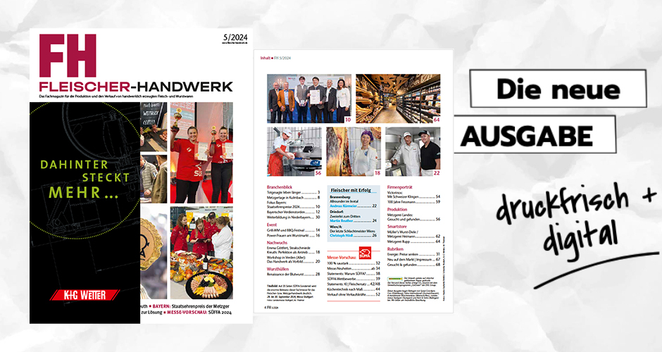 Druckfrisch und rechtzeitig zur SÜFFA 2024 in Stuttgart ist die Ausgabe 5/2024 von FH Fleischer-Handwerk erschienen. In dieser Ausgabe gibt es neben einer umfangreichen Messe-Vorschau zahlreiche interessante Reportagen, Portraits und vieles mehr.
