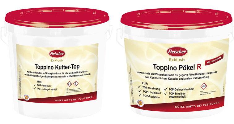 Die Kutterhilfsmittel „Toppino Kutter-Top“ und „Toppino Kutter-Top R mit Umrötung“ sowie der Lakezusatz „Toppino Pökel R“ unterstützen mit exakt aufeinander abgestimmten Rohstoffen die sichere und effiziente Herstellung hochwertiger Lebensmittel. Das neu eingeführte Sortiment steht nach Herstellerangaben für höchste Funktionalität, Sicherheit und Vertrauen. Es garantiert eine intensive Wirkung sowie exzellente Ausbeute (unter Idealbedingungen). Die drei Pulverprodukte lassen sich fein dosieren. Die beiden Kutterhilfsmittel für Brühwürste und brühwurstartige Erzeugnisse ermöglichen eine hohe Wirtschaftlichkeit. Sie bieten dem Anwender viele Vorteile, darunter das einfache Handling, eine optimale Bindung im Endprodukt, eine gleichbleibende, geschmeidige Konsistenz und eine gute Schnittfestigkeit sowie eine optimale Umrötung und Farbstabilität mit Toppino Kutter-Top R.