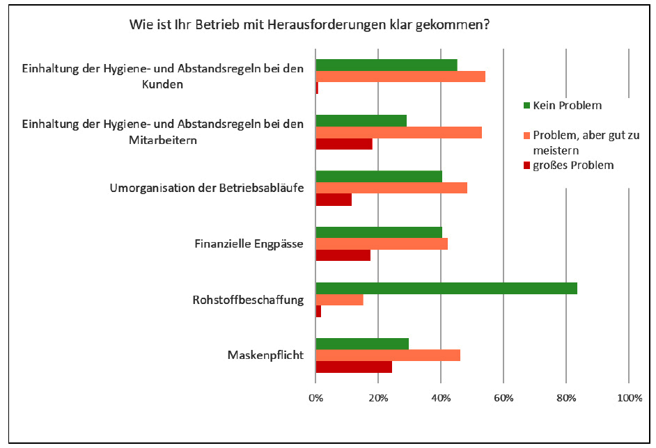 Der Umsatz über die Ladentheke war bei den an der Befragung beteiligten Fleischereien im Durchschnitt der bedeutendste Bereich. Insgesamt meisterten die Betriebe den Großteil der Herausforderungen gut. Bei der Rohstoffbeschaffung und die Einhaltung der Hygieneregeln bei den Kunden gab es keine unüberwindbaren Hindernisse. Nicht so einfach war es bei der Organisation der Mitarbeiter sowie der Einhaltung der Maskenpflicht. Bei rund 17 % der befragen Betriebe traten finanzielle Engpässe ein.