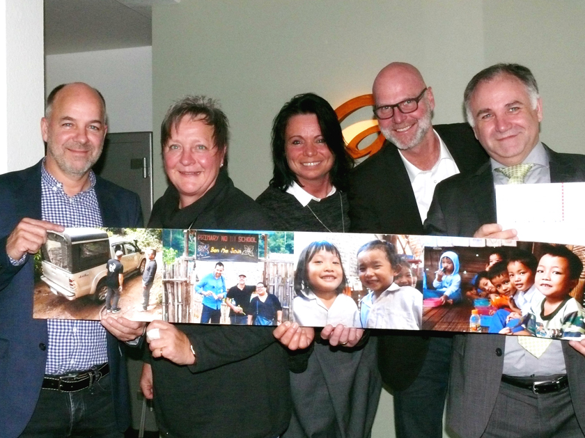 Im Bild (von li.): Bert und Gabriele Mutsaers, Natascha Poschmann (stellvertretende Betriebsratsvorsitzende von Bedford), Thorsten Schäfer (Geschäftsführer von Bedford) und Jörg Angerstein (Vorstandssprecher von „terre des hommes“) bei der Scheckübergabe.