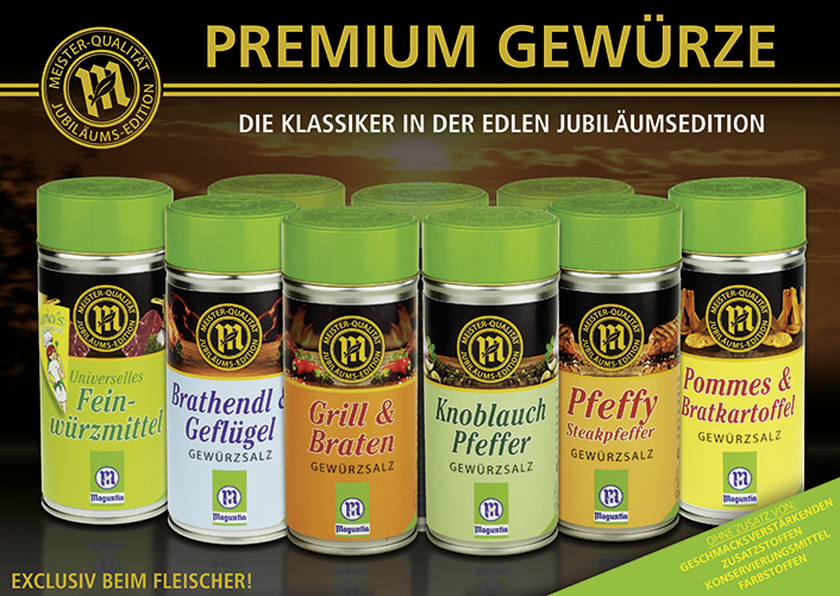Anlässlich des 111. Jubiläumsjahres präsentiert Moguntia für Kunden im Fleischerfachgeschäft exklusiv sechs Gewürzklassiker in einer edlen Blechdose. Seit ihrer Einführung sind die “Gewürzsalze mit Pfiff” (so der Slogan aus den 80er-Jahren) fast unverändert geblieben. Ohne geschmacksverstärkende Zusatzstoffe eignen sie sich für Fleisch, Gemüse, Salat oder Beilagen. Diese Gewürzklassiker stehen für kurze Zeit im 18er-Jubiläumstray zur Verfügung: