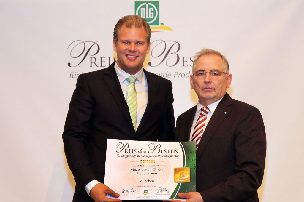 München. Die Münchner Traditionsmetzgerei vinzenzmurr wurde zum 26. Mal mit dem „Preis der Besten“ von der DLG ausgezeichnet. Diese Auszeichnung erhalten nur Betriebe, die über fünfzehn Jahre höchste DLG-Auszeichnungen erhalten haben. Von der DLG (Deutsche Landwirtschafts-Gesellschaft) wurden die selbst hergestellten Fleisch- und Wurstprodukte der Metzgerei vinzenzmurr jedes Jahr wieder auf Herz und Nieren geprüft und mit Gold ausgezeichnet. Für die Vielzahl dieser Auszeichnungen nahm Metzgermeister Alexander Brandl, Urenkel von Firmengründer Vinzenz Murr, die Medaille „Preis der Besten” entgegen: „Wir halten fest an unseren Qualitätsprinzipien und schlachten täglich selbst. Beste Fleischqualität der Marke Hofgut Schwaige bedeutet für uns, strenge Vorgaben und Kontrollen – vom Bauern über die eigene Herstellung bis zur Ladentheke in unseren Geschäften.” Bei der Verleihung zeigte er sich erfreut: „Wir sind mächtig stolz auf diesen ‚Preis der Besten’, genauso wie auf die über tausend Goldmedaillen für unsere Produkte, die 20 Bundesehrenpreise, das Ausbildungs-Ass, den Erasmus-Grasser-Preis sowie den Ökoprofit für Engagement im Umweltschutz. Das ist für mich Bestätigung und Ansporn zugleich!” www.vinzenzmurr.de