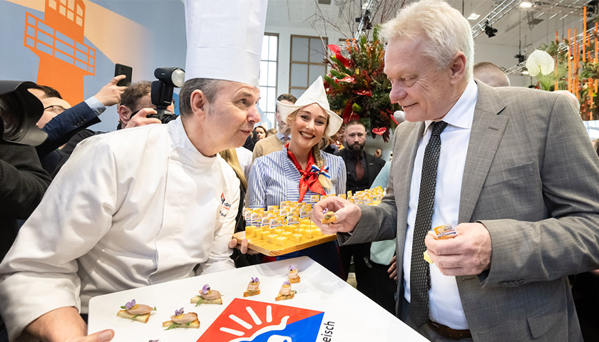 Weißwurstgrenze nach Berlin verlegt? Bei der VanDrie Group in der „Holland-Halle“ auf der Int. Grünen Woche (IGW) gab es Kalbsweißwurst. Auch Bundeslandwirtschaftsminister Alois Rainer (re.) probierte, auf Einladung von Femke Marije Wiersma, niederländische Ministerin für Landwirtschaft, Fischerei, Ernährungssicherheit und Natur.