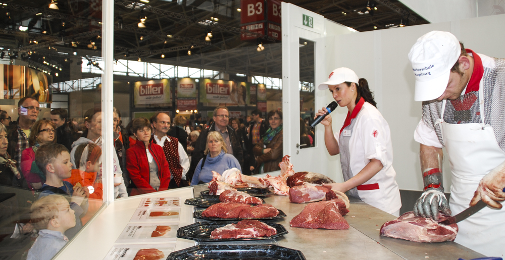 Regionalität, Qualität und Kompetenz in Produktion und Verkauf stehen im Fokus, wenn sich das bayerische Fleischerhandwerk vom 11. bis 17.3.2015 mit seiner Leistungsschau auf der Internationalen Handwerksmesse präsentiert. Der Auftritt mit einem modernen Stand (Fläche rund 1.300 m², Halle B3) gibt einen Einblick in moderne Produktionsmethoden sowie innovative Verarbeitungstechnologien. Ein Team junger Spitzenkräfte zeigt den Messebesuchern, warum das Fleischerhandwerk ein „Original“ ist. Das Herzstück des Messestandes ist die über 120 m² große „Gläserne Wurstküche“. Dort werden unter der fachlichen Leitung von Metzgermeister Robert Drexel neben Weißwürsten und Leberkäse viele weitere frische Produkte für den Imbiss- und Verkaufsbereich hergestellt. Vor den Augen der Messegäste werden auch Fleischteile zerlegt und Wurstbrät gekuttert. Eine fachlich fundierte Moderation gewährleistet, dass die Zuschauer nicht nur sehen, sondern auch wissen, was mit den Rohstoffen passiert und was die handwerkliche Produktion von der industriellen Produktion unterscheidet. Der Verkaufsbereich unter der Leitung von Metzgermeisterin Verena Hög beinhaltet das gesamte Sortiment eines Fleischerfachgeschäftes und berät die Kunden kompetent. Dies gewährleisten die mehrheitlich an der Fleischerschule Augsburg ausgebildeten Verkaufsleiter/innen. Verbraucher haben hier nicht nur Gelegenheit frische Waren einzukaufen, sondern können auch nützliche Tipps zum Plattenlegen oder zum Zusammenstellen von Präsentkörben mitnehmen. Diese werden live auf der Messe gefertigt.