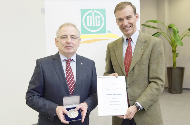 Der Vorstand der Deutschen Landwirtschafts-Gesellschaft (DLG) hat Prof. Dr. Achim Stiebing (im Bild li.) mit der Martin-Lerche-Medaille geehrt. Das ist die höchste Auszeichnung der DLG für die Fleischwirtschaft. DLG-Präsident Carl-Albrecht Bartmer (re.) überreichte die Medaille bei der Eröffnungsfeier der Internationalen DLG-Qualitätsprüfung Schinken und Wurst in Bad Salzuflen. Die DLG würdigt damit die außerordentliche Verdienste des Professors um die Weiterentwicklung der Fleischtechnologie und der gesamten deutschen Fleischbranche sowie um die DLG. Carl-Albrecht Bartmer bezeichnete den Geehrten als „Motor und Impulsgeber für die DLG-Fach- und -Testarbeit sowie für die gesamte Fleischbranche“. „Er hat Großartiges geleistet, das noch lange nachwirken wird.“