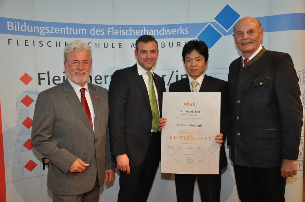 Nach 13 Wochen Meisterkurs an der Fleischerschule in Augsburg kehrt der Japaner Masaki Seki aus Nagano mit einem Meisterbrief zurück in seine Heimat. Dort wird er wohl zu den Besten seines Fachs gehören. „Das ist eine außerordentliche Leistung, die höchste Anerkennung verdient“, lobte Schulleiter Robert Baur den japanischen Meisterschüler. Masaki Seki hatte sich für die deutsche Meisterausbildung entschieden, da sie weltweit die anerkannteste auf dem Gebiet des Fleischerhandwerks ist. Robert Baur lobte das Engagement und den Fleiß des Absolventen: „Wenn man während des Unterrichts nicht alles versteht, bedeutet dies Nacharbeit.“ Masaki Seki habe sich jeden Abend mit den Inhalten des Tages beschäftigt und sie für sich aufgearbeitet. Gratulation gab es auch von Landesinnungsmeister Georg Schlagbauer und Jürgen Schmid, dem Präsident der Handwerkskammer für Schwaben. „Wir sind stolz, mit der verbandseigenen Fleischerschule eine Bildungseinrichtung in Augsburg zu haben, die japanische Schüler anlockt“, so Georg Schlagbauer. Auch Jürgen Schmid lobte die Zusammenarbeit mit dem Bildungszentrum des Fleischerhandwerks: „Hier lernen Schüler/innen aus aller Herren Länder und kehren mit den begehrten Abschlüssen in ihre Heimat zurück.“ www.fleischerschule.de