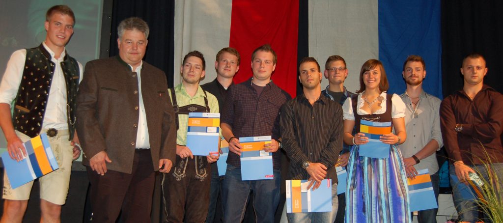 Stolz konnten dann die Obermeister der verschiedenen Berufsstände ihre Innungsbesten präsentieren. Obermeister Werner Braun bat dazu Johannes Ostermair von der Metzgerei Kleber in Petershausen zu sich auf die Bühne und überreichte ihm Urkunde und Wetzstahl als Symbol für das Handwerk. Die beste auszubildende Metzgereifachverkäuferin wurde Sarah Jung von der Metzgerei Gschwendtner in Langenpettenbach, die mit einem Notendurchschnitt von 1,25 bereits einen Staatspreis erhielt. Anschließend bat Werner Braun noch die übrigen frisch gebackenen Gesellen zu sich auf die Bühne und überreichte ihnen feierlich ihre Gesellenbriefe, ihr Tor in die Zukunft.