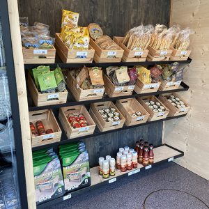 Im Holzregal links der drei Kühlschränke mit Doppeltüren befindet sich in hölzernen, offenen Kisten eine reichhaltige Auswahl der Schinkenspezialitäten Tiroler Art der Manufaktur in unterschiedlicher Grammatur. Die Kühlschränke enthalten u.a. Schinken (aufgeschnitten in 100g-Schalen), Handelswaren wie Käse (Allgäu od. Tirol), Knödelvariationen, Kaminwurzn, Portionswürste, Eier eines Bauernhofs aus dem Nachbarort, Leberkäse, Presssack, Würstchen und Präsentkörbe. In den kälteren Monaten Gulaschsuppe oder Sauerkraut im Beutel, von Frühjahr bis Herbst Grillspezialitäten. Im rechten Holzregal: Vinschgauer, Schüttelbrot, Nudeln aus Südtirol, Grissini, Senf, Pasteten im Glas. Sogar Einweggrills gibt es.