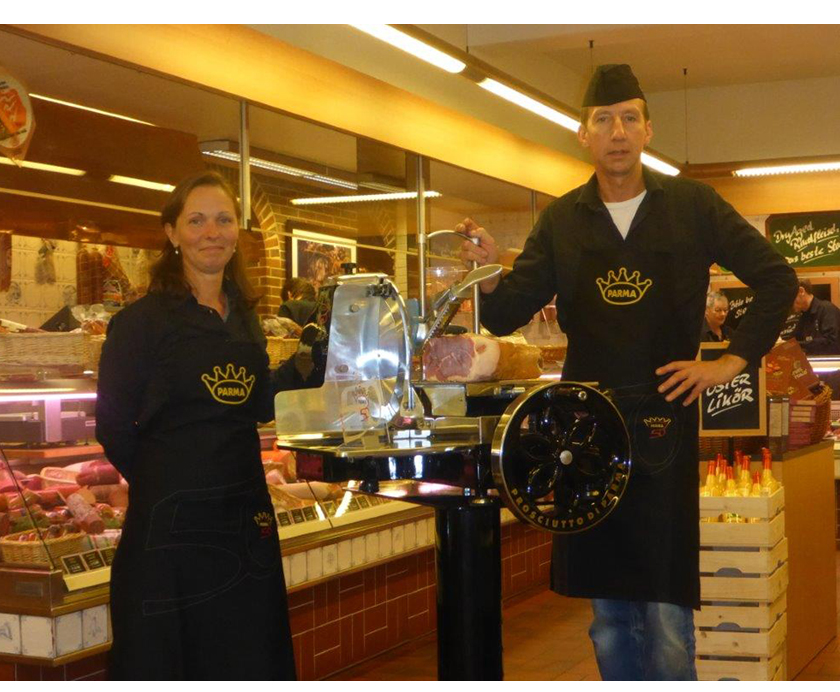 Der Verband der Parmaschinken-Hersteller, das Consorzio del Prosciutto di Parma, hat Olaf Mertens, Inhaber und Geschäftsführer des Feinkosthauses Ahrend in Hamburg, als „Parmaschinken-Spezialisten“ ausgezeichnet. Der erste Preis war eine große Schwungradmaschine in glänzendem Schwarz und mit silbernen, großen, runden und sehr scharfen Schneidemessern.