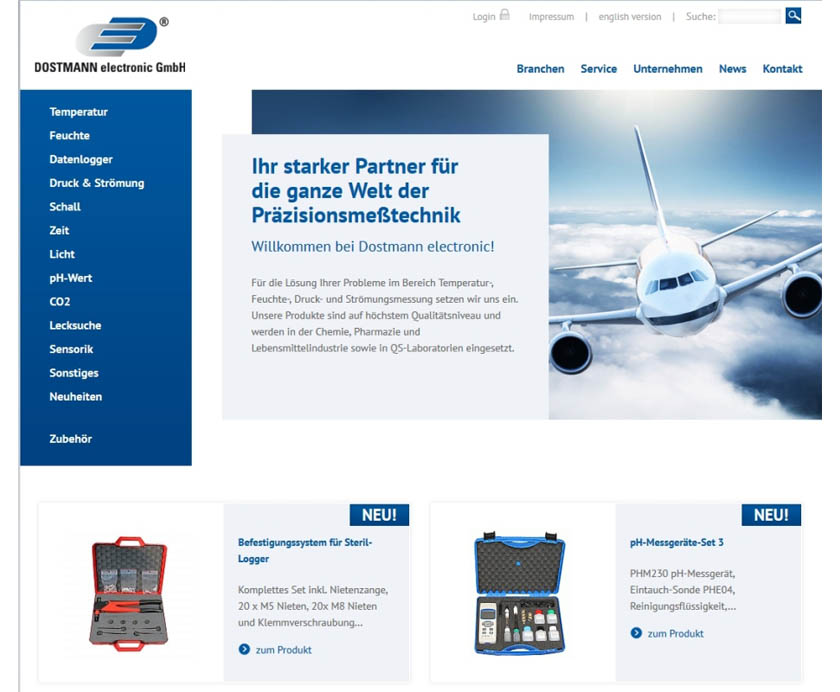 Dostmann electronic – Spezialist für elektronische Handmessgeräte für viele physikalische Größen wie z.B. Temperatur, Feuchte, Druck und Schall – stellt die neue deutsch- und englischsprachige Website mit einer umfassenden Übersicht über die Produktpalette vor. Der Internetauftritt der Dostmann electronic GmbH ist technisch, optisch und inhaltlich wesentlich überarbeitet. Neben einem modernen Design und aktueller Technik stehen vor allem die Anwendungsorientierung und die Anpassung der Inhalte an die Anforderungen der Kunden im Fokus.