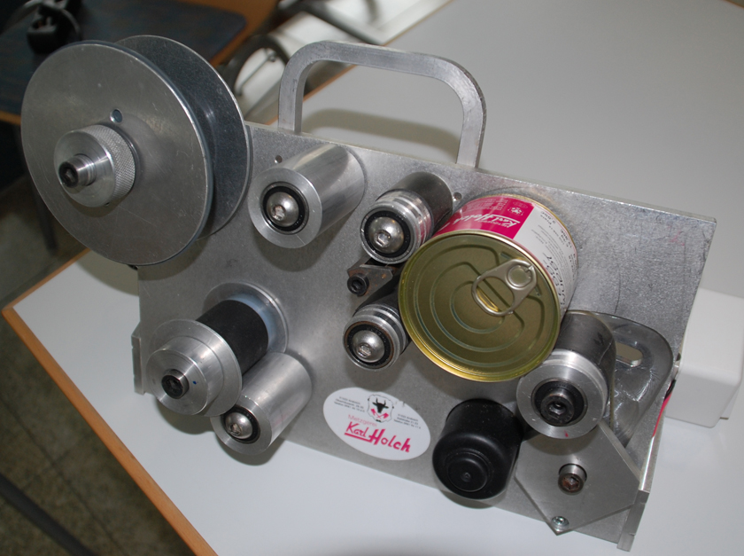 Um Kosten und Arbeitszeit beim manuellen Etikettierenzu senken, hat der Metzgermeister und Obermeister der Innung Ansbach, Karl-Heinz Holch, eine halbautomatische Etikettiermaschine entwickelt. Die Maschine etikettiert Blechdosen (Durchmesser: 75 bis 100 mm, Höhe: 60 mm), die per Hand eingelegt und nach dem Etikettieren auch per Hand entnommen werden. Die Dose dreht sich durch einen Motor, der mit einem Taster aktiviert wird. Durch vorsichtiges Drehen der Etikettenrolle links bewegt sich das Trägerband vorwärts über die Ablöskante links neben der Dose. Dort löst sich der Anfang des Etiketts vom Band und schiebt sich auf die Dose. „Sobald der Etikettenanfang auf der Dose klebt, geht alles automatisch“, betont Karl-Heinz Holch. Das Etikett wird durch die Drehung der Dose aufgebracht. Dabei zieht es das Trägerband immer weiter. Das leere Trägerband wird über eine Zugrolle nach unten gezogen. Um das Trägerband stets auf Spannung zu halten, wird die Zugrolle von der Etikettenrolle mit einem Übersetzungsverhältnis und einen passenden „Schlupf“ angetrieben. Am Ende des Etiketts ist der Antrieb des Trägerbandes beendet und man kann den Taster loslassen. Dach wird die etikettierte Dose entnommen und die nächste eingelegt. Der Metzgermeister hat ausgerechnet, dass die reinen Etikettierungskosten bei 10.000 Dosen/ Jahr mit der Maschine gegenüber der manuellen Etikettierung um 900 Euro gesenkt werden können. Hinzu kommen 34 Stunden gewonnene Zeit, was nochmals 918 Euro bedeutet. Nach Angaben von Karl-Heinz Holch amortisiert sich die Anfangsinvestition von 3.000 Euro plus MwSt. bei 850 Dosen pro Monat in 1 1/2 Jahren. www.metzgerei-holch.de
