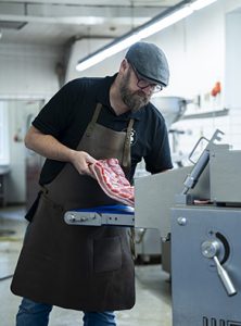 Und das ist es worum es seiner Meinung nach im Metzgerhandwerk gehen müsse: um Expertise. Erst recht, wenn der Fleischkonsum sich ändert: „Weniger Fleisch heißt nämlich bewusst und gut. Das spielt den Metzgern in die Hände“. Vor allem hierzulande, da in kaum einem anderen Land eine solche Kultur des Zerlegens existiere, wie in Deutschland. Wie passend, dass in Heiko Braths Produktion der Entschwarter eines deutschen Traditionsunternehmens steht: Die ASB 600 von Weber. Weber Food Technology ist heute zwar vor allem für Verarbeitungs- und Verpackungslinien für Aufschnittprodukte bekannt, die ersten Sporen verdiente das Breidenbacher Unternehmen…