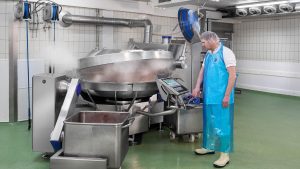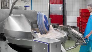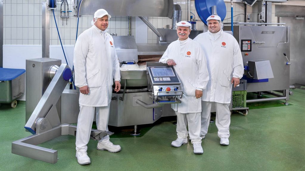 Welche Vorteile der Kutter speziell für Kochwurst-Sorten hat, erläutert Betriebsleiter Rudi Hischa. Sein ganzes Berufsleben lang und seit fast einem halben Jahrhundert arbeitet der Metzgermeister hier. „Die Alternative bei Leberwurst wäre es, die Zutaten im Kessel vorzukochen. Dabei gehen natürlich Geschmack und Inhaltsstoffe zum Teil im Kochwasser verloren. Außerdem sind das wesentlich mehr Arbeitsschritte…