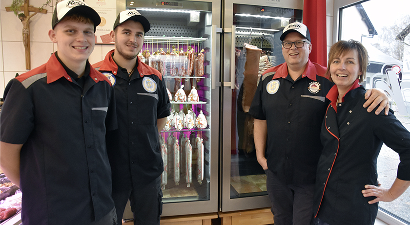 Die 1949 gegründete Metzgerei im westlichsten Landkreis Niederbayerns hat ihren Ursprung in 1937 bis 1940, als Markus Reschs Großvater Michael als „Hausmetzger“ in den Urkunden der Gemeinde erstmalig erwähnt wird. Nach dessen frühem Tod heiratete seine Frau Theresia den Metzger Englbert Wibmer. Der Sohn Michael II. und seine Frau Therese übernahmen 1984, bauten das Geschäft aus, errichteten das Schlachthaus und die Wurstküche. Markus Resch (50) machte seinen Meister 1993 an der 1. BFS Landshut, war nach dem frühen Tod des Vaters zehn Jahre Geschäftsführer hier und führt seit 2010 mit seiner Frau Carmen (48) den Betrieb. Ihr Sohn Michael Resch (20) ist seit 2022 Metzgermeister, war 2024 einer der ersten Fleischsommelier im Landkreis und ist seit zwei Jahren aktives Mitglied der Nationalmannschaft des Fleischerhandwerks. In der Zukunft wird Michael sein Wissen noch in anderen Betrieben im In- und Ausland erweitern und vertiefen, sein Bruder Tobias (li., 16) startete seine Metzgerlehre im letzten Herbst.