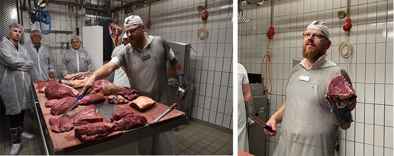 Von Kopf bis Fuß in Hygienekleidung gewandet, geht es zu Teil 2 des Kurses gegen 18:30 Uhr in die Wurstküche und Zerlegung der Metzgerei. Darauf haben die Teilnehmer und Teilnehmerinnen gewartet. Ihre Augen sind groß, es wird gefachsimpelt, Neugierde gewinnt die Oberhand. Dann ist es soweit. Assistiert von Metzgermeister und Fleischsommelier Mike Hepp, schiebt Philipp Sontag via Rohrbahn ein Hinterviertel einer 380-kg-Färse, die zwei Jahre auf der Weide graste, aus dem Kühlhaus in den Zerlegeraum. Ohne Rücken landet das stattliche Fleischteil auf dem Zerlegetisch. Das Zerlegen beginnt, viele zücken ihr Handy, machen Fotos und kleine Videos. „Hier: die Achillessehne“, sagt Philipp Sontag und zieht sie wie einen Expander vor seiner Brust weit auseinander. Detailliert erklärt werden die Fleischteile und Steak-Cuts nach und nach auf den Tisch gelegt: Inside Skirt, Flanksteak, Ribs, Roastbeef, Filet, „Birne“ – ein kleiner Muskel für Steaks und Medaillons –, Bürgermeisterstück, Nuss, Tafelspitz, etc. Alle hören aufmerksam zu und erfahren für was und wie man die einzelnen Special-Cuts am besten zubereitet.