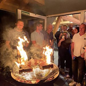 Voller Eindrücke und hungrig gehen die 25 Fleischfreunde und -freundinnen zurück in die „Fleischbühne“ – entledigt vom Plastikschutz der Hygienekleidung. Es ist 20:45 Uhr. Nun beginnt der gemütliche Teil. Auf einem kleinen Balkon neben der „Fleischbühne“ wurden inzwischen ein Smoker und ein runder Kugelgrill angeheizt sowie eine den Gästen entsprechende Zahl an Dry-aged-T-Bones sous-vide vorgegart. Die lodernde Glut in den Kugelgrill, Steaks auf den Rost, Flammen schlagen hoch, alles brutzelt. Nach einigen Minuten genießen die Gäste nicht nur dieses edle Fleisch, sondern weitere Spezialitäten aus der Frontcooking-Station, wie Brisket, Pulled Pork, Kraut- und Waldorfsalat, Baguette und verschiedene Salsas. Später nehmen sie ihren Einkauf vakuumiert und in Taschen gepackt und ein „Teilnahme-Diplom“ mit nach Hause. Ein gelungener Abend in der Metzgerei Sontag ist zu Ende. Marco Theimer