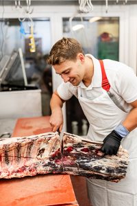 Marius Karl Hanten lebt und liebt seinen Beruf. Und das schon von Kindesbeinen an. „Unsere Metzgerei gibt es schon seit 1947, immer in Familienhand. Schon als kleiner Junge hat mein Vater mich mit zur Arbeit genommen – ich bin mit dieser Tradition auf- und in sie hineingewachsen“, sagt der Fleischermeister. Er beschreibt sich selbst mit den Adjektiven positiv, abenteuerlustig und fleißig – eigentlich müsste man auch noch sportlich hinzufügen, „Im Handwerk geht es um Qualität, Tierwohl und Begeisterung, in der Industrie lediglich um Masse und Zeit. Das hat meine Überzeugung und Leidenschaft fürs Fleischerhandwerk gestärkt“, sagt der 28-Jährige. Da verwundert es nicht, dass das Fleischerhandwerk für ihn mehr ist als nur ein Job, vielmehr seine Berufung. „Die individuelle Verarbeitung des Tieres hin zu einem nachhaltigen Lebensmittel, bei dem ich weiß, wie das Tier gelebt hat, wie es geschlachtet wurde und was in der Wurst ist – und ich das an meinen Kunden weitergeben kann – das ist es, was mich mit Stolz erfüllt“, sagt Marius. Stolz ist es auch, was er über das Handwerk, die handwerkliche Arbeit empfindet. „Wir sind nicht nur die Wirtschaftsmacht von nebenan, nicht nur Nachbarn und Freunde, sondern auch Arbeitgeber in der Region. Und es ist wichtig, das Wissen und Können um das Handwerk an die nächsten Generationen weiterzugeben“, sagt der frisch gebackene Vater eines Sohnes.