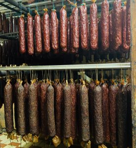 Es geht über eine Treppe nach oben. Im Dachgeschoss des Stammhauses aus dem 16. Jahrhundert hängen sie: unzählige Stracke, Runde und Feldgieker der nordhessischen Ahle Wurst reifen hier bis zu sieben Monate. Schlachtwarm hergestellt stellt die Fleischerei 80 % geräucherte und 20 % luftgetrocknete Ahle Wurst – rote Wurst wie sie Moritz Becker nennt – her. Bei 17°C und 75 % Luftfeuchtigkeit. „Je nördlicher in Hessen, desto mehr Luftgetrocknete gibt es“, erklärt er. Weitere beliebte Spezialitäten sind Kartoffelwurst mit 20 % Kartoffelanteil in verschiedenen Varianten, Bratwürste, Hausmacher Wurst sowie eine reichhaltige Auswahl an Convenience- und Fertiggerichten in Beuteln, Take-away-Trays oder Gläsern. Auch die Mittagsgerichte für die Stadtfiliale finden großen Absatz. Das Schweinefleisch kommt vom Schlachthof und Fachhandel Helwig aus Ziegenhain von Bauern aus 50 km Umkreis. Der Landkreis zählt die meisten Schweinemäster in Hessen. Rinderviertel bzw. Teilstücke kaufen sie zu.