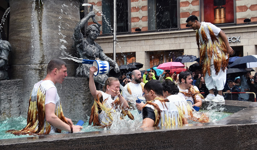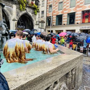 Während es beim Festzug vom Viktualienmarkt über das „Tal“ zur Kirche St. Peter („Alter Peter“) noch trocken war, regnete es nach dem Gottesdienst schon etwas. Und bereits bevor das Glockenspiel erklang und die Zeremonie um 12:15 Uhr startete, öffnete der Himmel seine Schleusen und es goss in Strömen – 2019 und 2022 war es auch schon so. Trotzdem ließen sich viele Münchner, Freunde, Familien, Metzgerkollegen und Touristen diesen „nassen Spaß“ nicht entgehen. Dabei wurden auch die um den Brunnen Stehenden trotz Regenschirmen nass.