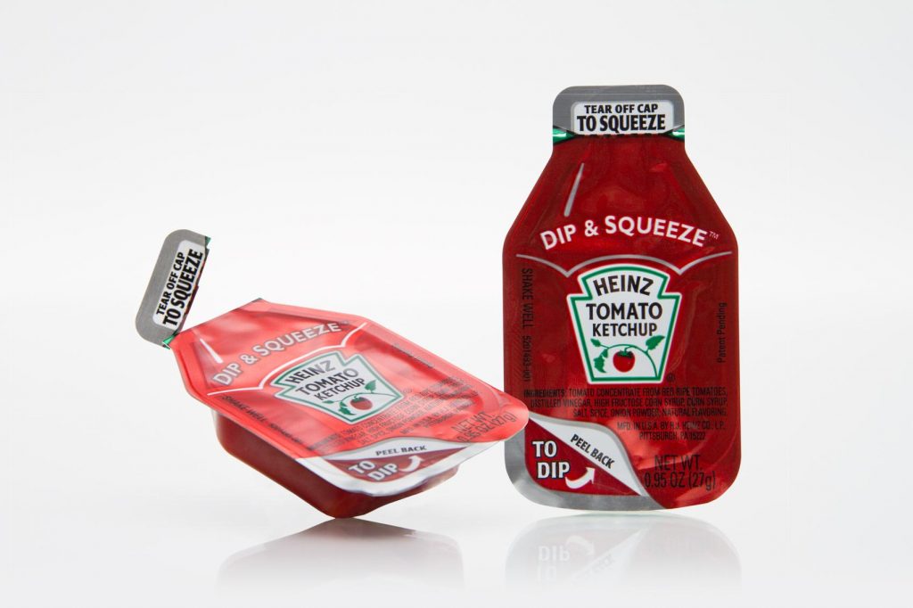 Mit der Dip & Squeeze®-Packung haben Heinz und MULTIVAC eine besonders verbraucherfreundliche Single-Serve-Ketchup-Verpackung entwickelt. Ihr zweifacher Öffnungsmechanismus lässt dem Konsumenten die Wahl, ob er den Ketchup entweder über der Speise auszudrücken oder die Verpackung als Dippschale verwenden möchte. Das innovative Format wird auf vollautomatisierten, schlüsselfertigen End-to-end-Verpackungsanlagen von MULTI-VAC produziert.