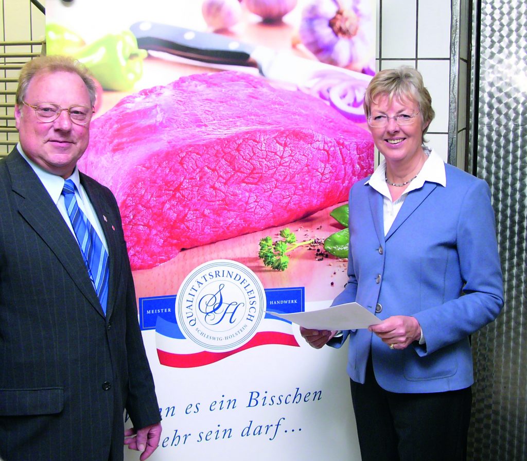 Kronshagen. Gemeinsam mitLandwirtschaftsministerin Dr. Juliane Rumpf präsentierte LandesinnungsmeisterPeter Raabe das neue Qualitätssiegel, das "Rindfleisch ausSchleswig-Holstein" kennzeichnet und das Vertrauen der Verbraucher stärkensoll. Die Veredelung und Vermarktung regionaler landwirtschaftlicher Produkteist ein wichtiges Ziel der schleswig-holsteinischen Agrarpolitik, weshalb sichdas Landwirtschaftsministerium mit 8.000 Euro an dem Projekt beteiligte. 20 von180 Innungsbetrieben nutzen das Logo "QualitätsrindfleischSchleswig-Holstein" schon, das von Fleischereien verwendet wird, die sichjährlich kontrollieren lassen.