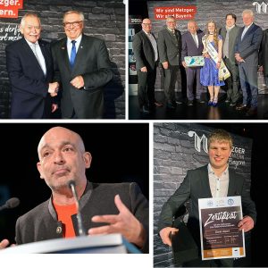 Doch bevor Alois Rainer, Dr. Florian Herrmann, Django Asül und Konrad Ammon die fast unzählige Anzahl an Urkunden und Pokalen an die Betriebe überreichten, fanden sie sich auf der Bühne zu einigen Ehrungen ein. Für sein außerordentliches Engagement und 20 Jahre an der Fleischerschule in Augsburg wurde Schulleiter Anton Schreistetter geehrt, dessen Vorgänger Robert Baur die Llaudatio hielt. Über ein Stipendium des Fleischsommelier Deutschland e.V. für eine Weiterbildung zum Fleischsommelier an den Fleischerschulen Augsburg, Landshut oder Weiterstadt und ein hochwertiges Messer (Friedr. Dick) freute sich der Europameister der Fleischer 2025, David Hilpert. Der beste Fleischer Deutschlands 2025, Philipp Auerswald, bekam dieses auch – allerdings in Abwesenheit.