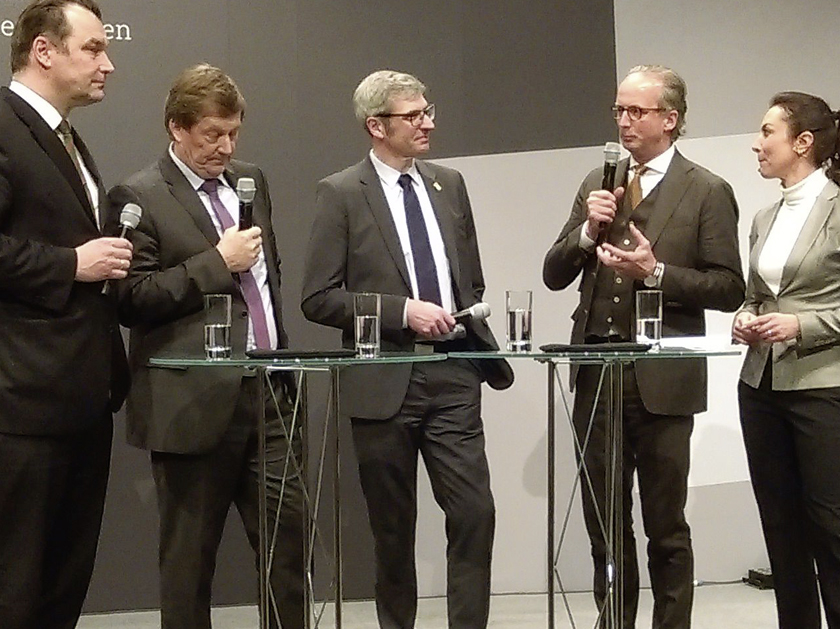 Vertreter der Arbeitsgemeinschaft Lebensmittelhandwerk im Zentralverband der Deutschen Handwerks (ZDH) und des Deutschen Bauernverbandes sind auf der Internationalen Grünen Woche in Berlin zu einer Podiumsdiskussion zusammengetroffen. Teilnehmer der Diskussion waren: