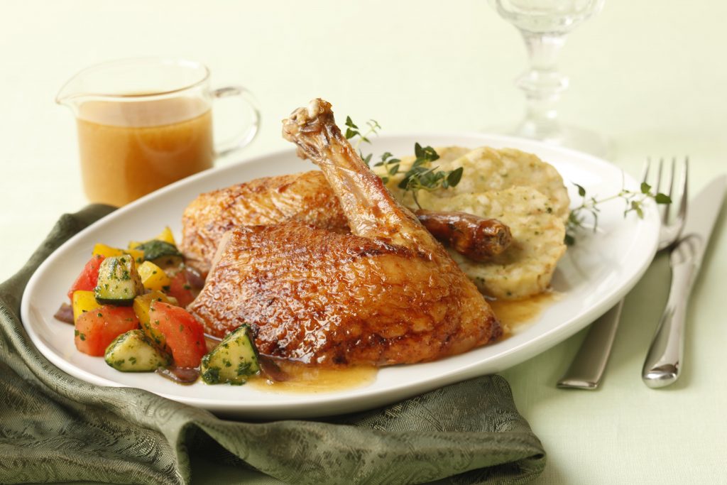 4. Ente herausnehmen, die Spieße entfernen und tranchieren. Fülle wie einen Serviettenknödel aufschneiden. Gemüse zur Ente servieren.