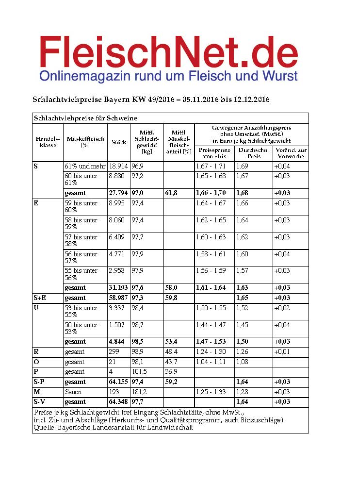 Schlachtviehpreise Bayern KW 49/2016