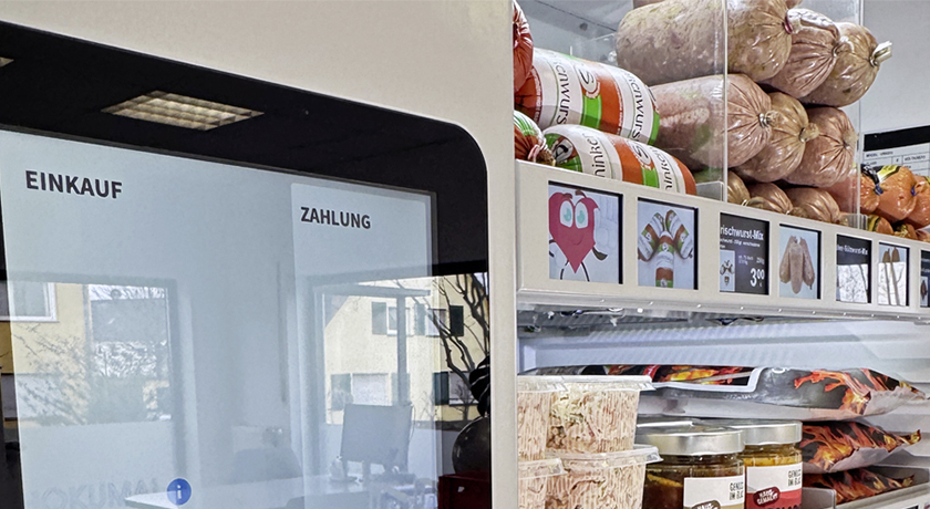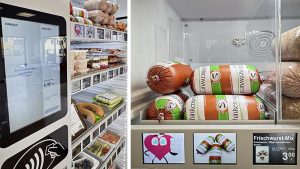 In dem gekühlten Fridgeomaten werden auf sechs Ebenen verpackte Fleisch- und Wurstwaren, aber auch Bowls, fertig zubereitetet Mahlzeiten, Salate und Suppen aufmerksamkeitsstark und HACCP-konform präsentiert. Die lichtstarke wie energieeffiziente LED-Innenbeleuchtung und die acht digitalen Displays erhöhen die Sichtbarkeit und Fernwirkung. Die digitalen Displays ermöglichen neben den Informationen zu Inhaltsstoffen und der Darstellung von Fotos und Grafiken die zeit- und mengengesteuerte dynamische Preisauszeichnung. Das erhöht den Abverkauf und vermeidet Food-Waste.