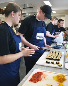 Zum zweiten Mal nach 2023 ging das Finale im „Concept Court“ am Firmenstandort von Homann in Bad Essen-Lintorf über die Bühne. Für die Zubereitung der Snacks hatten die fünf Finalisten und Finalistinnen von 10 bis 12 Uhr Zeit. Es wurden Teige aus Quinoa und Mehl zubereitet, Gemüse in Streifen geschnitten, Muffinförmchen ausgelegt und befüllt, Waffeleisen und Backöfen auf Temperatur gebracht, Brokkoli und Cocktailtomaten geschnitten und gegart, Nori-Blätter und Dekorationen vorbereitet u.v.m. Hektik kam dabei kaum auf. Die drei Profi-Paten – Guerilla Chef-Gründer Simon Kolar (Gastronomie), Fleischerei-Fachverkäuferin und Fleischsommeliere Catharina Bardun (Fleischer) und Caroline Bosselmann (Bäcker) – mussten nur wenig helfen. Die Stimmung war locker. Nach drei Stunden – inklusive der Zusatzaufgabe – wurden die Snacks auf Tellern dekorativ angerichtet. Der Final-Snack musste mindestens je ein Homann- und Bonduelle-Produkt enthalten. Der Textildienstleister Weitblick stellte Motto-Shirts sowie mit den Namen der Finalisten bestickte passgenaue dunkelblaue Jacken zur Verfügung, die erst nach der Pokalübergabe angezogen werden durften und als besondere Erinnerung dienen.
